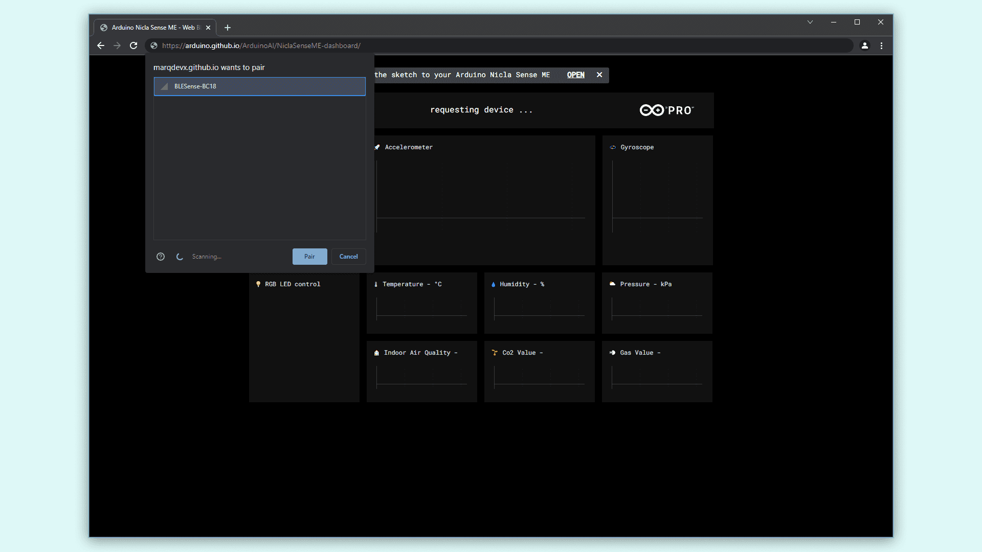 To connect your board to the dashboard, you will need to click on the top left button which says "Connect Board". A pop up will be displayed in your browser and it starts searching for Bluetooth® devices. This application leverages the WebBLE functionality of your browser.
